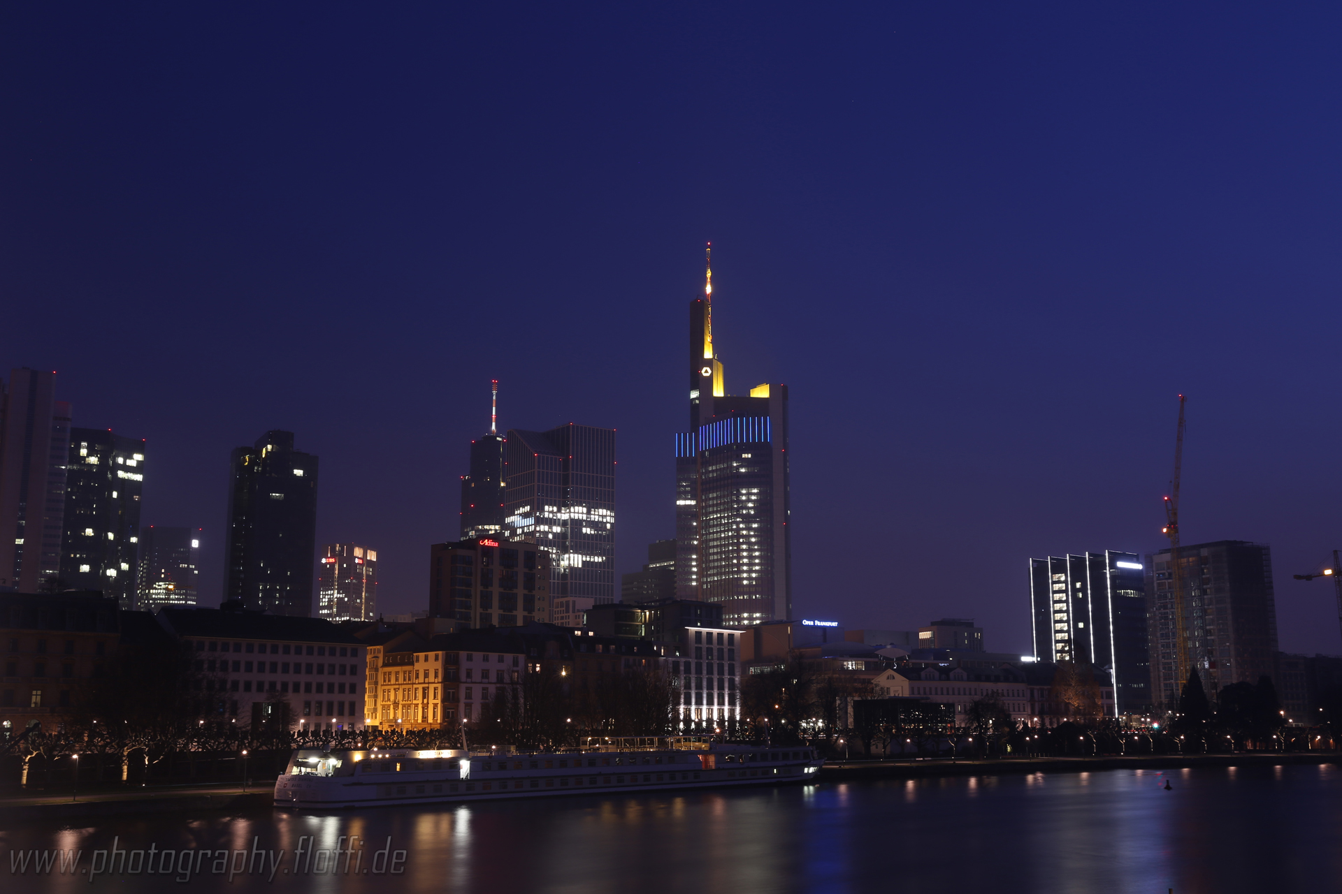 Frankfurt am Main 2016 18. August 2017 Allgemein, General Sonnenuntergang Beleuchtete Brücke in Frankfurt Skyline Frankfurt am Main Sicht auf die Europäische Zentralbank Brücke in Frankfurt Schienen Sicht auf das Banker Viertel Architektur am Main Main Teilen:
